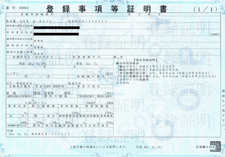 For US$40, you will receive a scanned, independent, unaltered copy of the registration document for your vehicle, accompanied by a translation into English. For vehicles exported after 2007, it gives the most accurate record of your vehicle odometer reading at every subsequent re-registration (which occurs bi-annually) in Japan.